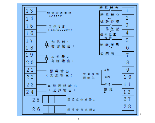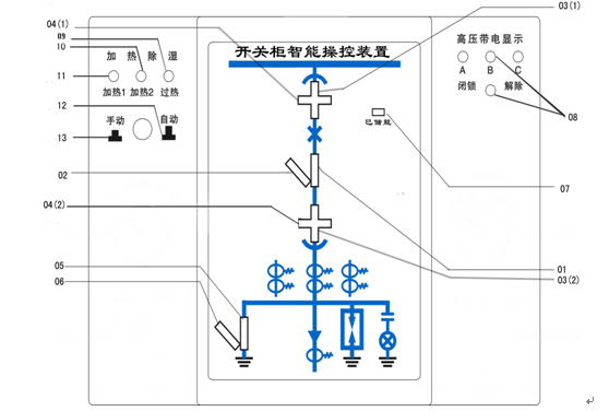 01斷路器合指示 08帶電顯示及閉鎖 02斷路器分指示 09過(guò)熱指示 03(1)、03(2)工作位置指示 10加熱2指示 04(1)、04(2)試驗(yàn)位置指示 11加熱1指示 05接地開關(guān)合指示 12自動(dòng)加熱標(biāo)識(shí) 06接地開關(guān)分指示 13手動(dòng)加熱標(biāo)識(shí) 07儲(chǔ)能指示