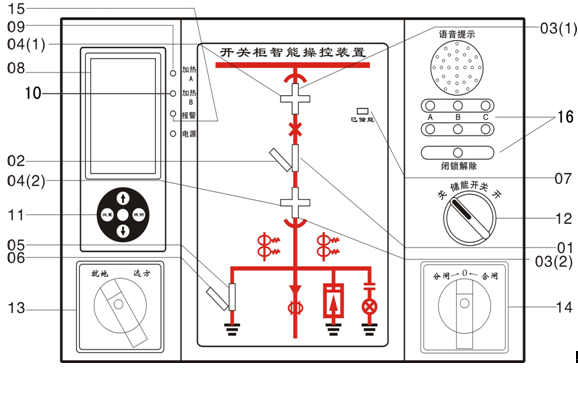 三、模擬顯示部分與功能(注:此面膜圖為常規(guī)面膜圖,具體面膜圖以實(shí)物為準(zhǔn)) 01斷路器合指示 09加熱A指示 02斷路器分指示 10 加熱B指示 03(1)、03(2)工作位置指示 11 操作鍵盤(pán) 04(1)、04(2)試驗(yàn)位置指示 12 儲(chǔ)能旋鈕 05 接地開(kāi)關(guān)合指示 13 遠(yuǎn)方/就地轉(zhuǎn)換開(kāi)關(guān) 06 接地開(kāi)關(guān)分指示 14分/合閘轉(zhuǎn)換開(kāi)關(guān) 07 儲(chǔ)能指示 15 報(bào)警指示 08 液晶顯示界面 16帶電顯示及閉鎖 3.1斷路器狀態(tài)顯示 斷路器合閘并且分閘回路完好時(shí),紅色01模擬條發(fā)光; 斷路器分閘并且合閘回路完好時(shí),綠色02模擬條發(fā)光。 3.2手車(chē)位置顯示 無(wú)源觸點(diǎn)輸入,工作位置觸點(diǎn)輸入閉合時(shí);紅色03①、03②垂直模擬條發(fā)光,顯示斷路器位于工作位置。 試驗(yàn)位置觸點(diǎn)輸入閉合時(shí);綠色04①、04②水平模擬條發(fā)光,顯示斷路器位于試驗(yàn)位置。 手車(chē)位于試驗(yàn)位置與工作位置之間時(shí),發(fā)光條03①、03②、和04①、04②同時(shí)閃爍。 手車(chē)移出開(kāi)關(guān)柜時(shí),紅色03①、03②和綠色04①、04②發(fā)光條均不發(fā)光,表示手車(chē)已斷電。 3.3接地開(kāi)關(guān)位置顯示 無(wú)源觸點(diǎn)輸入閉合,紅色05 垂直模擬條發(fā)光,顯示接地開(kāi)關(guān)合閘; 無(wú)源觸點(diǎn)輸入斷開(kāi),綠色06 斜向模擬條發(fā)光,顯示接地開(kāi)關(guān)分閘。 3.4彈簧儲(chǔ)能顯示