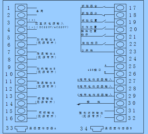 無(wú)源觸點(diǎn)輸入閉合,黃色07 指示燈發(fā)光,顯示斷路器已儲(chǔ)能。 3.5帶電顯示及閉鎖功能 1、LED啟輝電壓(KV):額定相電壓×(0.15~0.65)。 2、閉鎖啟控電壓(KV):額定相電壓 ×0.65。 3、當(dāng)三相同時(shí)不帶電時(shí),閉鎖解除燈亮,啟動(dòng)電磁鎖動(dòng)作。 3.6自動(dòng)加熱除濕控制及溫濕度數(shù)字顯示功能 可帶2路溫濕度傳感器,可顯示現(xiàn)場(chǎng)的溫濕度數(shù)值,并且用戶可根據(jù)需要自行的設(shè)置加熱/除濕/排風(fēng)輸出的上下限值。當(dāng)環(huán)境濕度大于所設(shè)定濕度的上限值或環(huán)境溫度小于所設(shè)定溫度的下限值時(shí),啟動(dòng)加熱;當(dāng)環(huán)境濕度小于所設(shè)定濕度的下限值且環(huán)境溫度大于所設(shè)定溫度的上限值時(shí),停止加熱;當(dāng)環(huán)境溫度≥50℃時(shí),無(wú)條件停止加熱,防止過(guò)熱損傷。 當(dāng)有人站在柜前停留時(shí),啟動(dòng)柜內(nèi)自動(dòng)照明。 3.8手動(dòng)照明 按下操作鍵盤(pán)中的照明鍵,為手動(dòng)啟動(dòng)柜內(nèi)照明(顯示屏上方有一個(gè)“燈泡符號(hào)”顯示),重復(fù)按鍵則為關(guān)閉手動(dòng)照明。 3.9智能語(yǔ)音防誤提示功能 1、當(dāng)斷路器合閘狀態(tài),誤將手車(chē)從試驗(yàn)位置推至工作位置時(shí),語(yǔ)音提示“請(qǐng)分 斷路器”。 2、接地開(kāi)關(guān)合閘狀態(tài),誤將手車(chē)從試驗(yàn)位置推至工作位置時(shí),語(yǔ)音提示“請(qǐng)分接地開(kāi)關(guān)”。 -3- 3、斷路器合閘狀態(tài)、接地開(kāi)關(guān)合閘狀態(tài),誤將小車(chē)從試驗(yàn)位置推至工作位置時(shí), 語(yǔ)音提示“請(qǐng)分?jǐn)嗦菲?、?qǐng)分接地開(kāi)關(guān)”。 4、當(dāng)柜體主回路送電時(shí),語(yǔ)音提示“本回路已帶電”。 3.10轉(zhuǎn)換開(kāi)關(guān)功能 裝置面板上設(shè)有分閘/合閘轉(zhuǎn)換開(kāi)關(guān)(或按鈕)、遠(yuǎn)方/就地轉(zhuǎn)換開(kāi)關(guān)、儲(chǔ)能開(kāi)關(guān)等操作開(kāi)關(guān),方便用戶操作。 3.11通訊功能 RS485通訊接口,通訊波特率可設(shè)置為1200bps~9600bps;用于讀取裝置內(nèi)部數(shù)據(jù)和參數(shù)。 3.12溫濕度傳感器斷線報(bào)警功能 當(dāng)A路溫濕度傳感器沒(méi)有接觸好時(shí)溫度就會(huì)顯示- - -、濕度就會(huì)顯示- - -; 當(dāng)B路溫濕度傳感器沒(méi)有接觸好時(shí)溫度就會(huì)顯示- - -、濕度就會(huì)顯示- - -。 四.安裝尺寸與接線圖