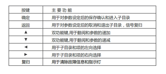 狀態(tài)指示燈由5個指示燈組成,各燈功能如下: 3.1.2 操作鍵盤 鍵盤由6 個鍵組成,各鍵功能如下: