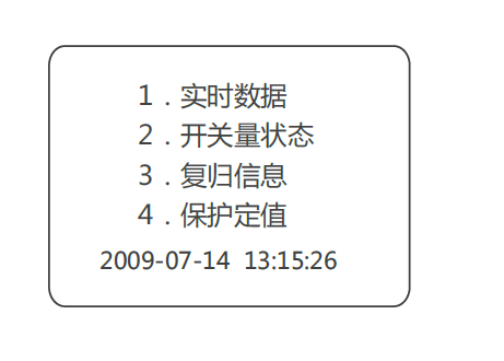 3.2 菜單界面介紹 3.2.1 顯示主界面 主菜單內(nèi)容如下: 1. 實時數(shù)據(jù) 2. 開關(guān)量狀態(tài) 3. 復(fù)歸信息 4. 保護定值 5. 傳動調(diào)試 6. 事件記錄7. 時間設(shè)置 8. 開關(guān)量設(shè)置 9. 一次數(shù)據(jù)