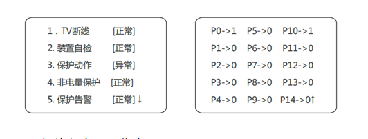 3.2.5“復(fù)歸信息”子菜單界面顯示 當面板上的“告警”或“事故”燈亮起時,依照以下步驟查找告警源并做相應(yīng)處理:參看第一個界面是否有[異常],如果異常項為3、4、5項,再下翻至下一頁查看為哪一個保護元件動作,如下面右圖所示,P0-P14對應(yīng)保護設(shè)置中的15個保護元件,指示為“1”表示為動作元件: