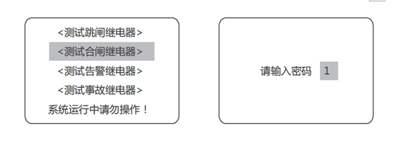 操作方法:本界面必須輸入口令后方能進入,用'▲' '▼'鍵移動光標到需測試的繼電器上,按“確認”鍵,彈出密碼輸入框,如果密碼正確,繼電器動作并且返回調(diào)試菜單。