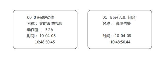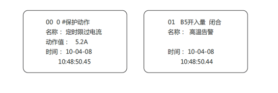 3.2.8 “事件記錄”子菜單界面顯示 事件記錄包括時間、 序號、事件類型和詳情信息用'▲' '▼' 鍵鍵查看各事件記錄,序號越小,事件發(fā)生的時間越近,0號為最近的一次事件
