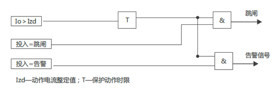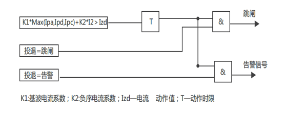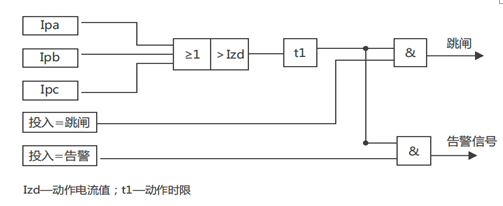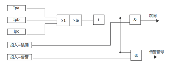 4.2 保護邏輯圖 4.2.1定時限過電流 工作原理:任一相電流大于整定值時,經(jīng)過給定的時限延時后保護跳閘或告警。將三個定時限過電流保護元件設(shè)置成不同的時限就可構(gòu)成三段式過電流保護,時限設(shè)為0時構(gòu)成電流速斷保護。如果與告警信號繼電器進行關(guān)聯(lián),在滿足動作條件后,報警繼電器出口同時動作。