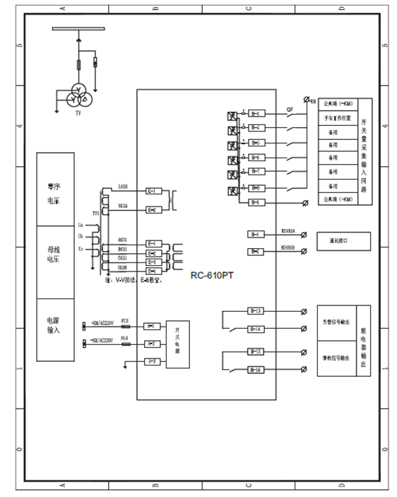 4.2.8 三相一次重合閘 本重合閘方式采用保護啟動方式,在每個跳閘保護元件中均有 “重合”設(shè)置選項;當檢測到投入的保護動作后且已選擇啟動重合閘,重合閘自動投入計時開始,在設(shè)定的時限內(nèi)未出現(xiàn)異常后,進行重合。當重合于故障線路時,如果啟動重合閘的保護為合閘后加速保護,則瞬時跳閘;其它保護啟動的重合閘則按其所整定的時限跳閘。 五、注意事項 5.1 通電前檢查 1、核對保護裝置背面的產(chǎn)品銘牌中的工作電壓、控制電源、交流電流、電壓額定值等參數(shù)是否與訂貨單一致,如果不一致請與本公司聯(lián)系。 2、裝置的接地線必須可靠接入開關(guān)柜的接地線,不允許將開關(guān)柜前面板與柜體的連接軸作為接地連接,并且接地線必須滿足低阻抗要求(小于1歐姆)。 5.2 投運檢查及說明 1、檢查裝置各電纜及背后端子是否連接固定可靠。 2、通電后液晶和指示燈顯示是否正常。 3、開入量輸入檢查:進入“開關(guān)量狀態(tài)”菜單、按設(shè)計圖紙對實際接入的開關(guān)量逐一進行變位試驗,檢查畫面顯示與實際狀態(tài)是否一致。 4、開出量:菜單中傳動各繼電器動作是否正確。 5、模擬量輸入檢查:從開關(guān)柜(PK屏)的交流電流(5A)、電壓(57.7V) 輸入端加入額定值,進入“開關(guān)量狀態(tài)”菜單、按設(shè)計圖紙對實際接入的開關(guān)量逐一進行變位試驗,檢查畫面顯示與實際狀態(tài)是否一致。 6、第一次運行產(chǎn)品時,必須進行相關(guān)定值整定才能確保保護裝置正常運行。 7、保護定值按電力調(diào)度定值整定通知單整定,定值單所有保護定值整定好后,核對無誤后存檔。(未要求的保護項目設(shè)定退出)。 5.3 常見問題解決 問題1:斷路器已經(jīng)合上閘,微機面板仍顯示分位。 答:微機分合位指示燈與開入量1(B-3)有關(guān)。 1、確認斷路器輔助開接點一端接B-3,另外一端接-KM。 2、斷路器在合位時,用萬用表測量B-3跟B-9正常有AC/DC220的電壓。 3、直接在B-3跟B-9上加AC/DC220,微機指示燈顯示合位。 問題2:保護裝置發(fā)生故障跳閘或者告警時如何查看。 答:可在“事件記錄”屏中查詢故障或者告警信息,30條事件記錄,第0條為最新記錄,第29條為最舊,每條記錄都詳細記錄了時間、故障類型、故障值。 問題3:保護裝置發(fā)生故障跳閘或者告警時如何復(fù)歸。 答:操作進入“復(fù)歸信息”菜單,查詢哪個保護動作或告警,從“復(fù)歸信息”中退出主菜單即可復(fù)歸故障信息。 問題4:保護裝置出廠密碼是多少。 保護裝置出廠密碼為“1”,用戶如對保護裝置密碼進行修改,應(yīng)妥善保管,以免遺忘。 六、典型原理接線圖