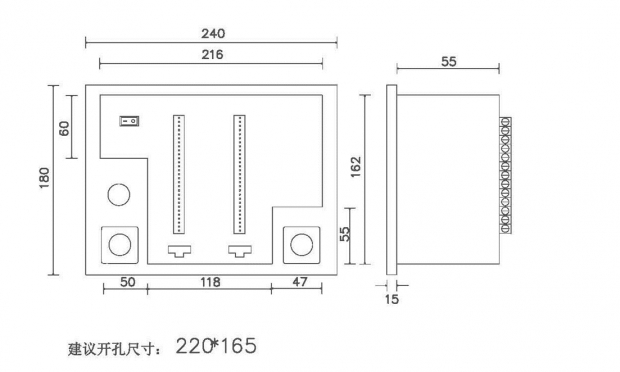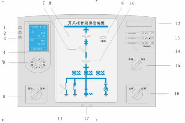 1、加熱A指示,如果加熱A啟動,則此指示燈點亮; 2、加熱B指示,如果加熱B啟動,則此指示燈點亮; 3、加熱報警燈; 4、液晶顯示; 5、按鍵; 6、遠(yuǎn)方/就地轉(zhuǎn)換開關(guān); 7、斷路器分/合指示; 8、試驗/工作位置指示1; 9、儲能指示,如果儲能正常則此指示燈點亮; 10、試驗/工作位置指示2; 11、接地開關(guān)分/合指示; 12、型號; 13、帶電指示以及閉鎖指示; 14、喇叭,用于語音提示播報; 15、儲能開關(guān); 16、分合閘開關(guān); 17、人體感應(yīng)窗口;