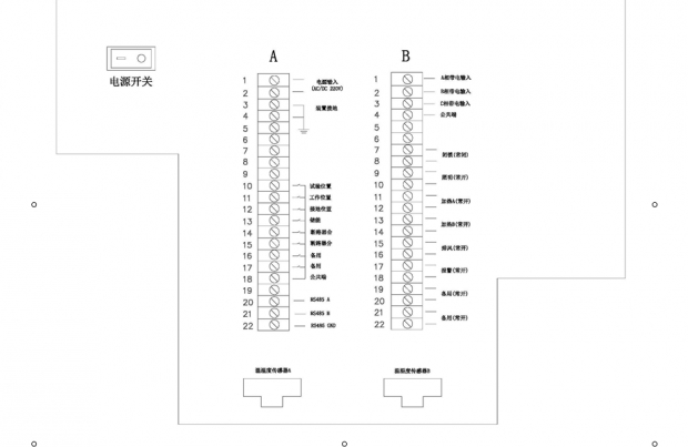 1) 可選配一或兩路溫濕度傳感器; 2) 通過操作按鍵選擇手動溫濕度控制還是自動 溫濕度控制功能,詳見液晶顯示章節(jié)。 3) 自動模式: * 液晶屏顯示:自動加熱; * 環(huán)境濕度大于“濕度上限”值或環(huán)境溫度小于“溫度下限值”時啟動加熱,加熱接點閉合,加熱指示燈亮。加熱到濕度小于“濕度下限”或溫度大于“溫度上限”時,停止加熱,加熱接點斷開,加熱指示燈滅; * 連續(xù)加熱一個小時后,停止一小時。然后根據(jù)條 件判斷是否繼續(xù)加熱; * 環(huán)境溫度大于40℃,無條件停止加熱; * 環(huán)境溫度大于“溫度上限”時,啟動排風(fēng),排風(fēng)接點閉合,排風(fēng)到“溫度下限”停止排風(fēng)。排風(fēng)輸出端接點斷開; * 用戶可設(shè)置溫濕度的上下限; 4) 手動模式: * 液晶屏顯示:手動加熱; * 通過按鍵強(qiáng)制加熱,當(dāng)啟動加熱一個小時后,停止一小時,然后根據(jù)條件判斷是否繼續(xù)加熱; * 環(huán)境溫度大于40℃,無條件停止加熱; 5) 禁止模式: * 此模式下,系統(tǒng)無條件禁止加熱;